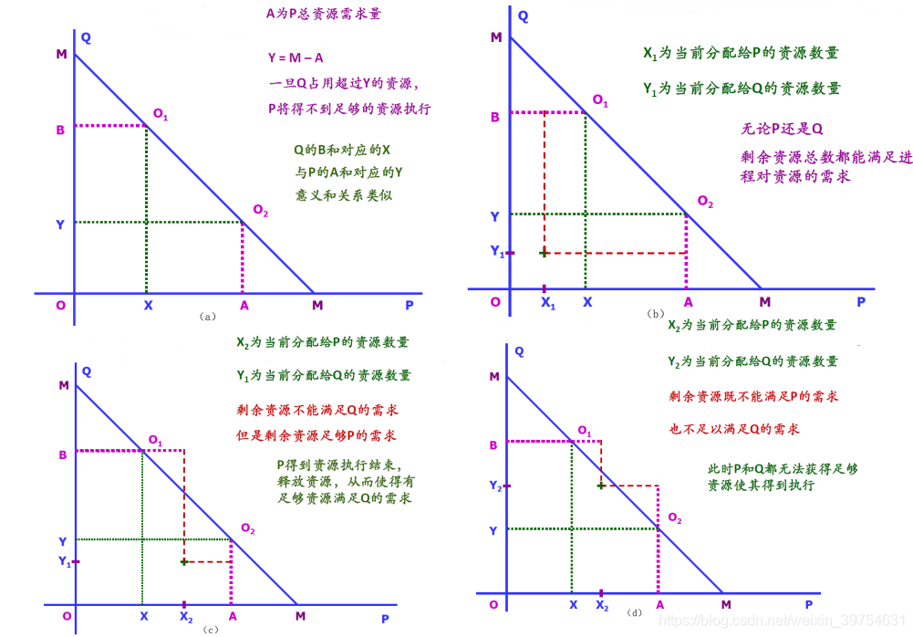 (b)中X1为进程P的资源占用量,Y1是Q进程的占有量,那么剩余的资源能满足P或Q进程对资源的需求量;©中X2为进程P的资源占用量,Y1是Q进程的占有量,那么剩余的资源可以满足P进程对资源的最大需求量,等P进程释放资源后Q进程就可以继续执行,这时对资源的分配就是有条件的;(d)中剩余资源既不能满足P进程也不能满足Q进程对资源的最大需求量。