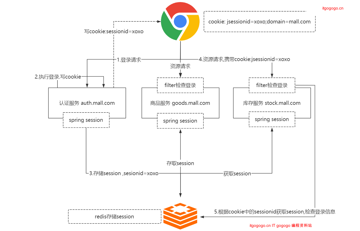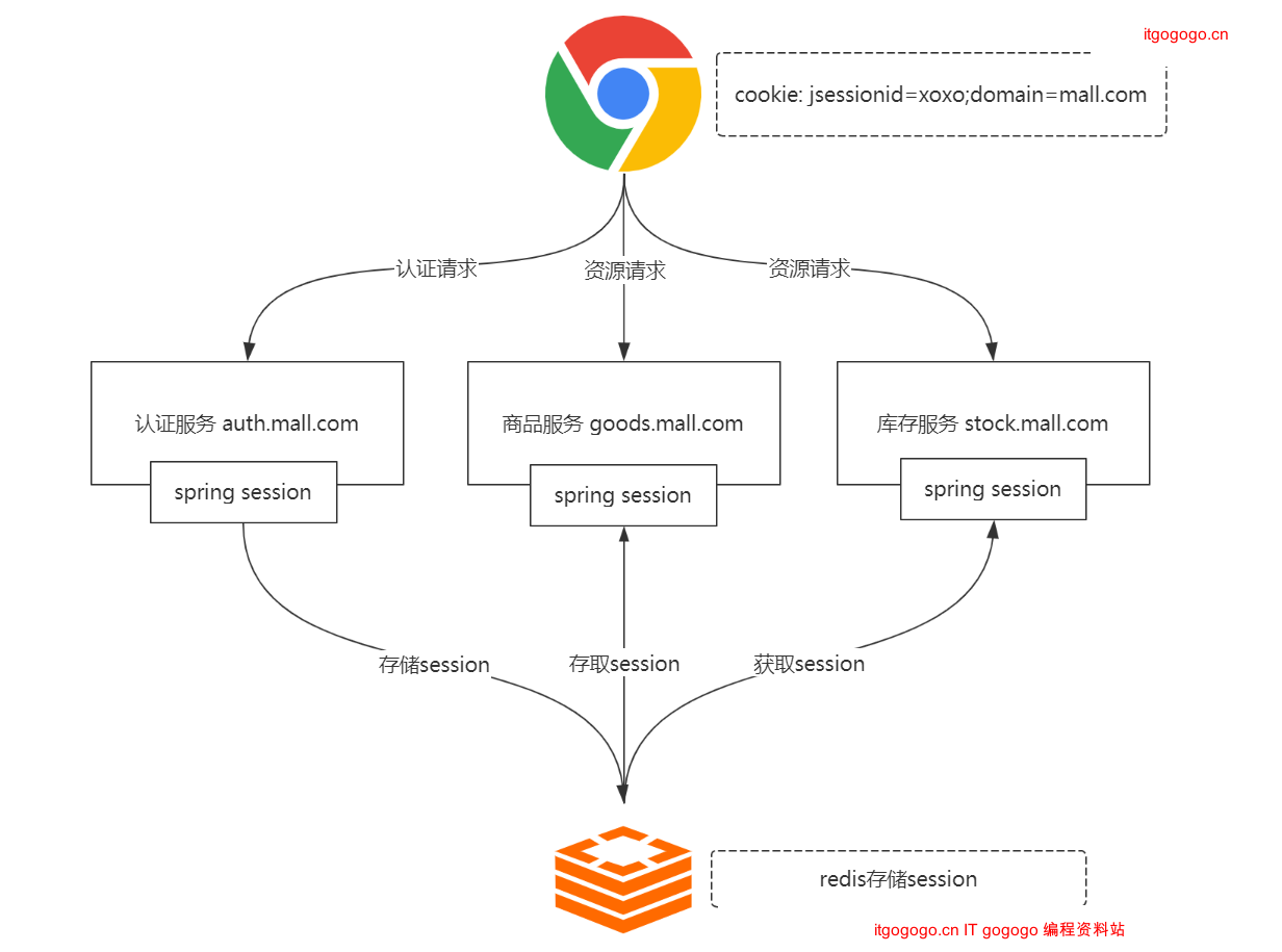 SpringSession干的工作就是修改getSession和setSession方法基于Redis存取Session,同时要注意的是Session是通过Cookie传递sessionid的,如果要让多个服务都能接受到sessionid拿到session,需要把cookie的存储域扩大,如有三个系统“auth.mall.com”,“goods.maill.com”,“stock.mall.com”,那我们需要把domian设置成“mall.com”,这样一来浏览器带着cookie请求任何一个系统都可以获取到sessionid,然后从Redis中获取Session。
