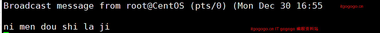 wall(write all)给所有用户发信息。wall后直接加要发的信息就可以发送出去,此时包括发送者在内的所有人都会收到信息,还会显示发消息的用户名和发消息的时间。