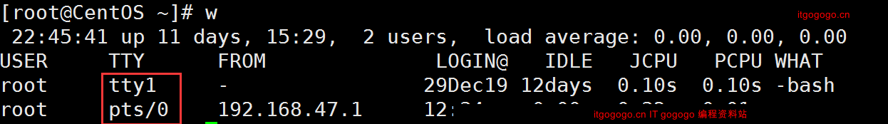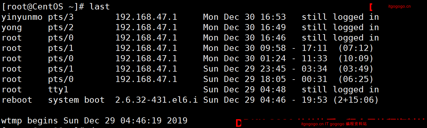 发现root用户正在登录,且登录了2次,一次是本地登录(在虚拟机中),tty表示本地登录,pts表示远程登录,数字代表终端号,表示不同终端,还可以看到登录时间、登录主机的IP地址。